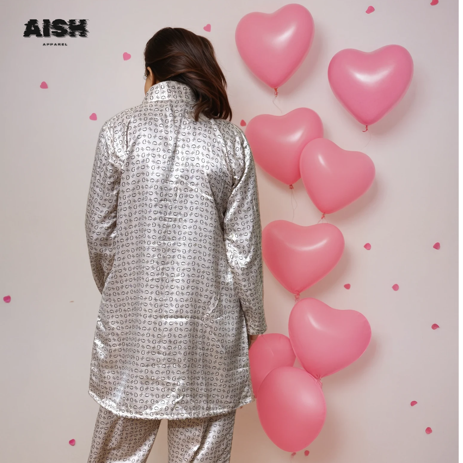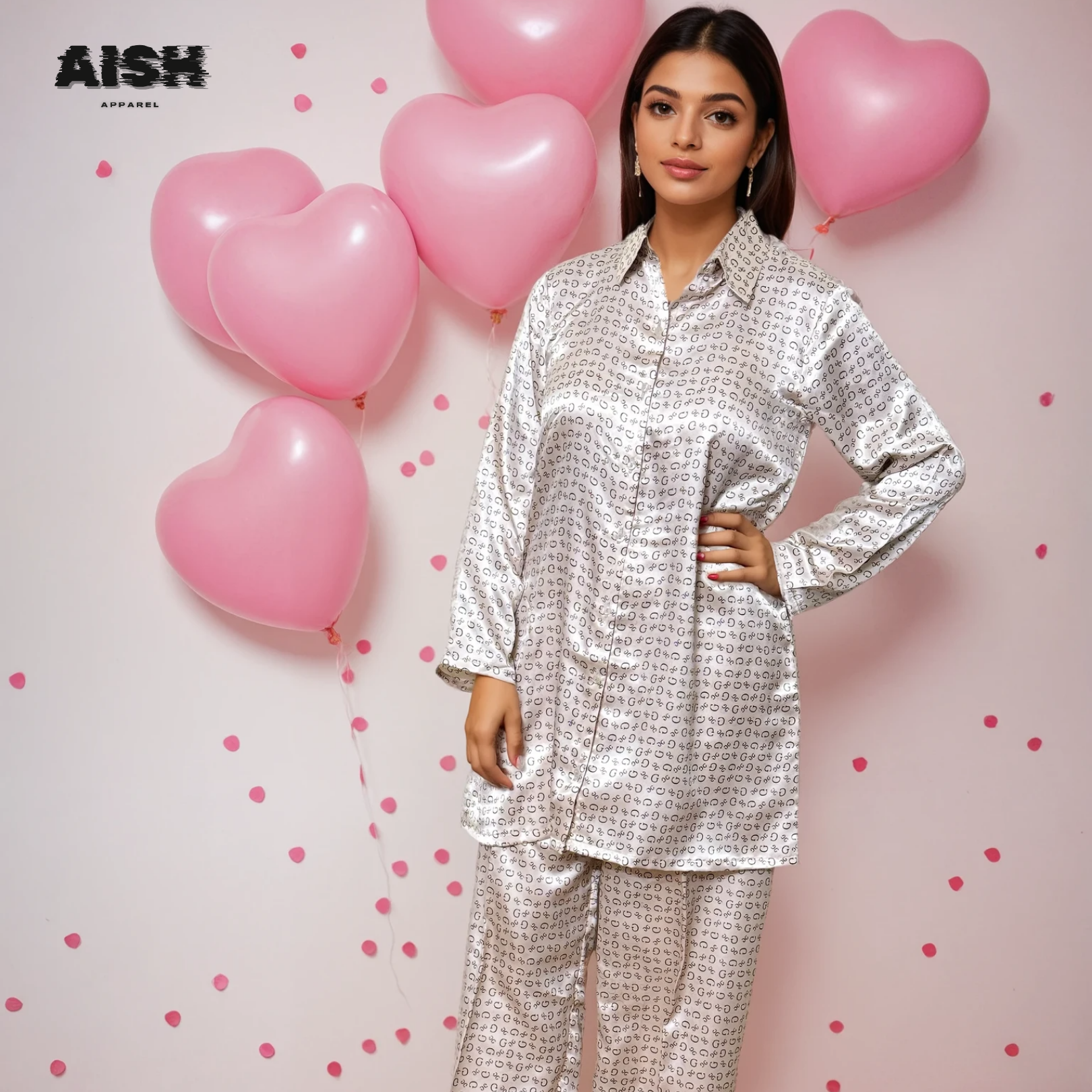 An elegant two-piece co-ord set in luxurious off-white silk, designed for effortless sophistication. The set features a sleek top and matching trousers, offering a polished and cohesive look. The lightweight silk fabric adds a touch of refinement, making it ideal for versatile styling across various occasions.